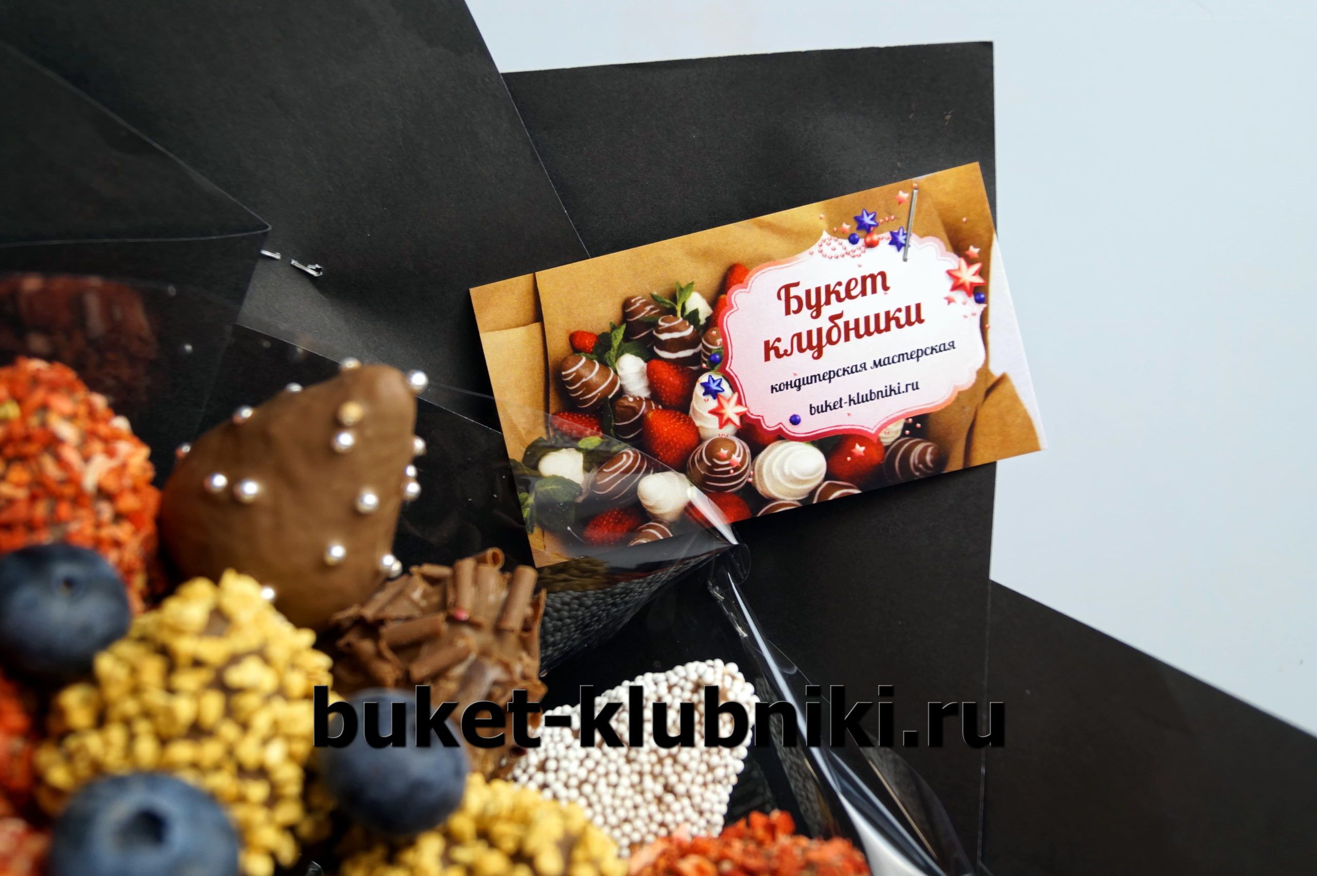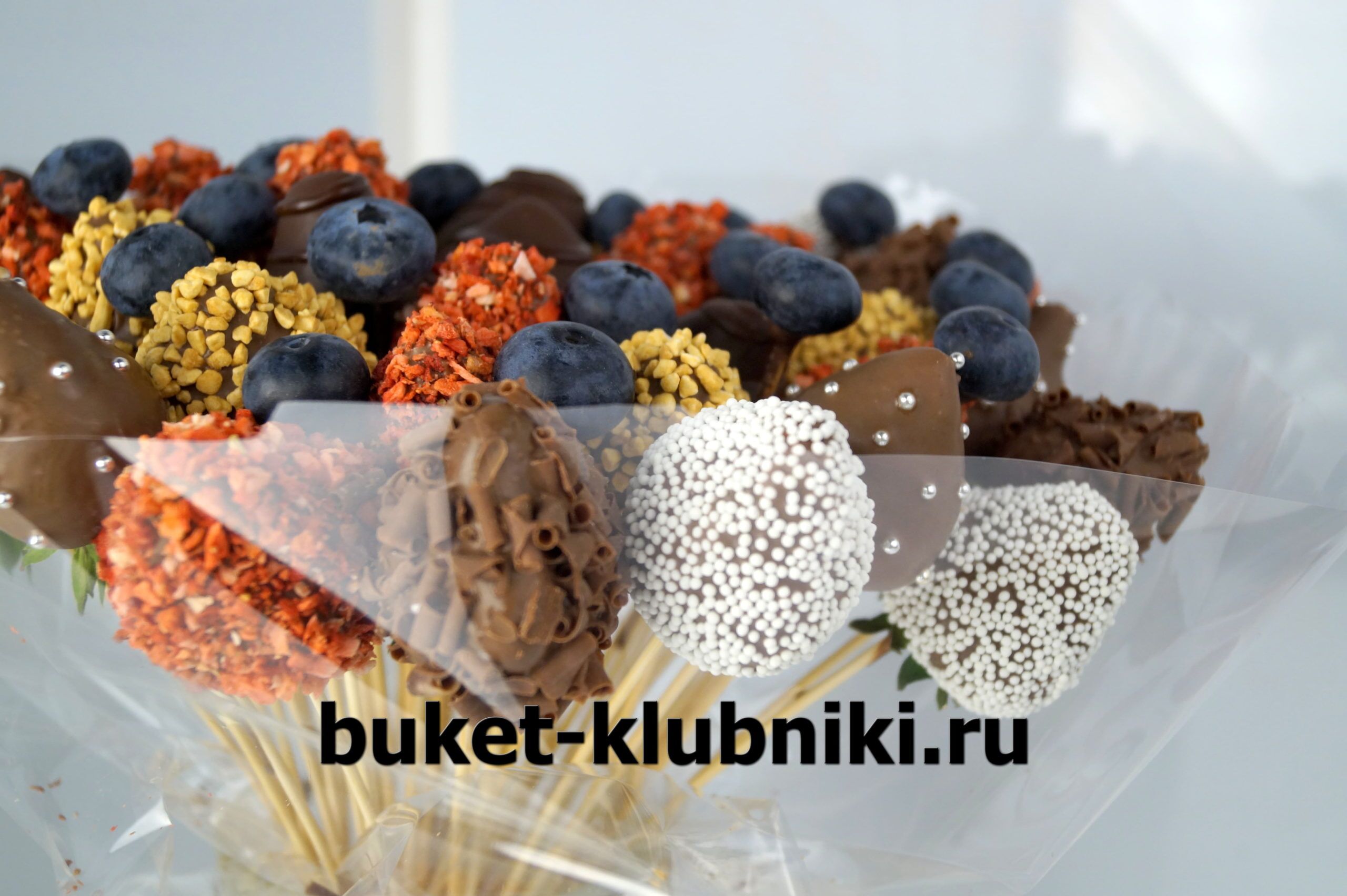 Между ягодами покрытыми шоколадом находятся сочные ягоды голубики зафиксированные на палочках. Контрастная съедобная композиция выполнена из кондитерских посыпок: