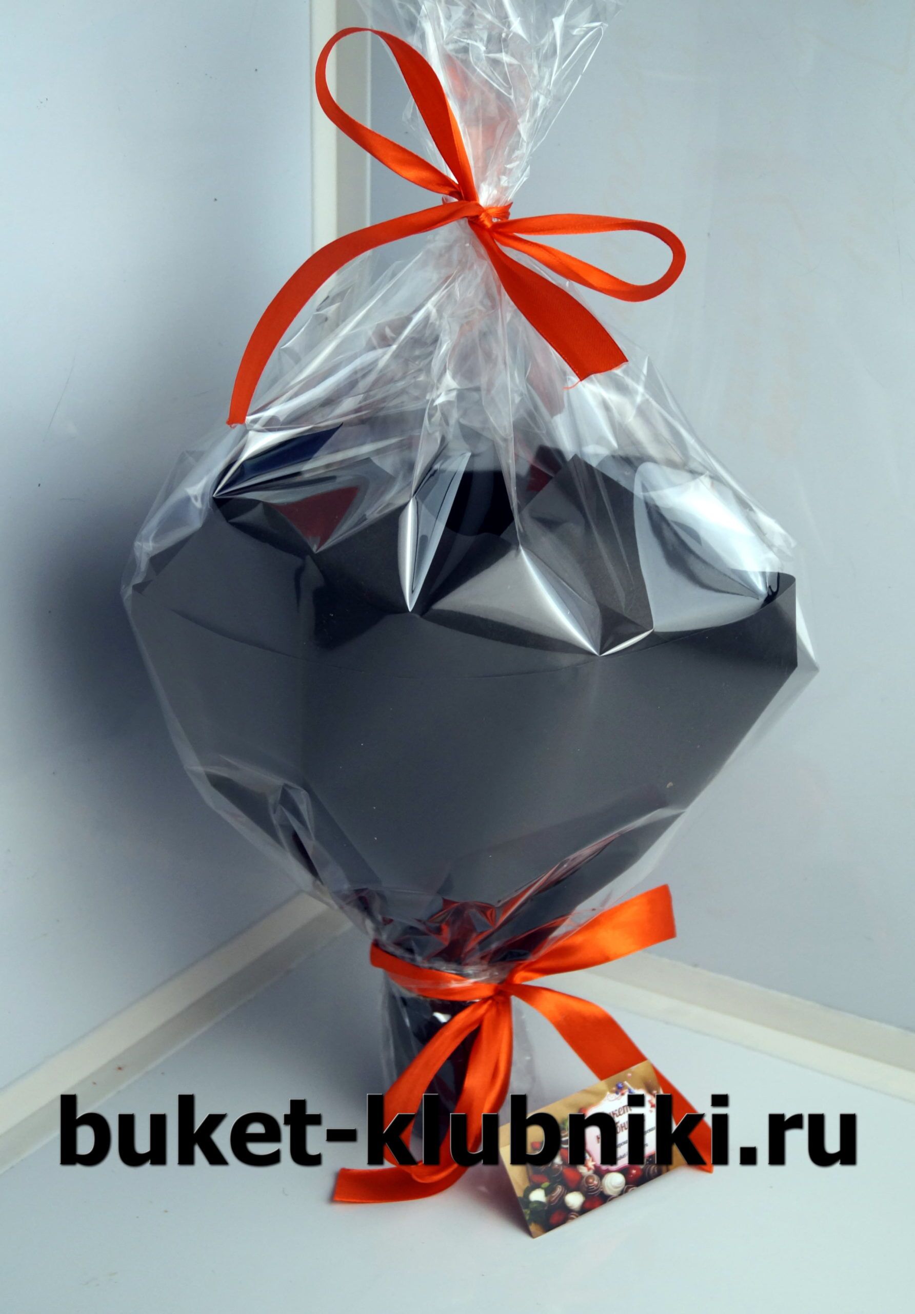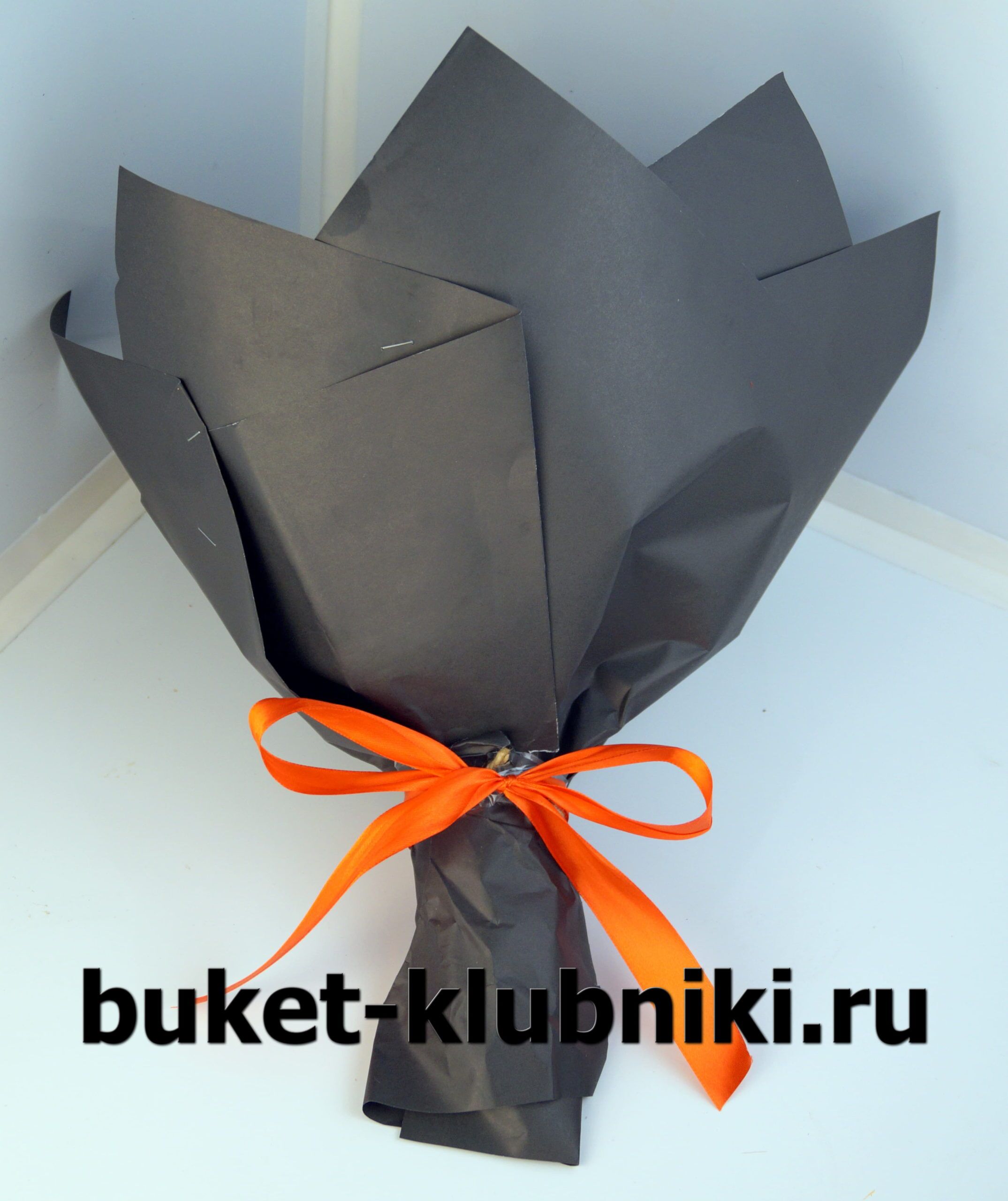 Букет упакован в черную флористическую бумагу с фиксацией яркой лентов.