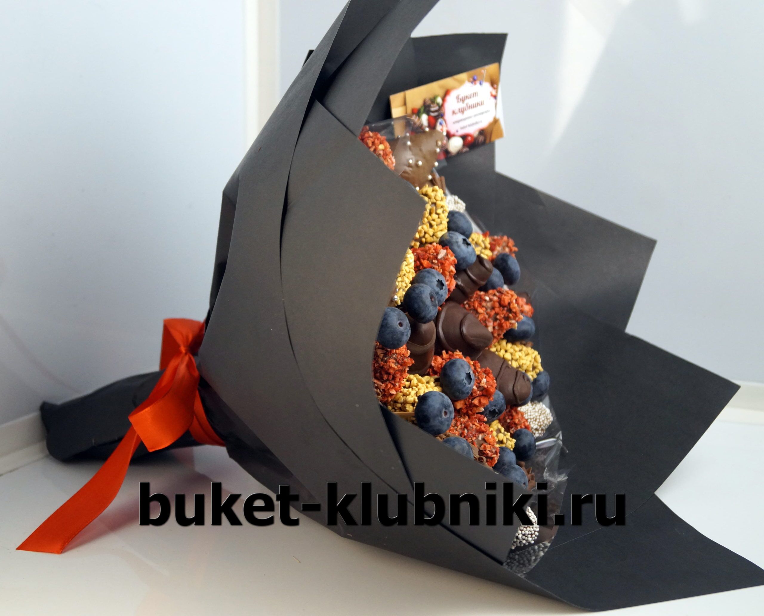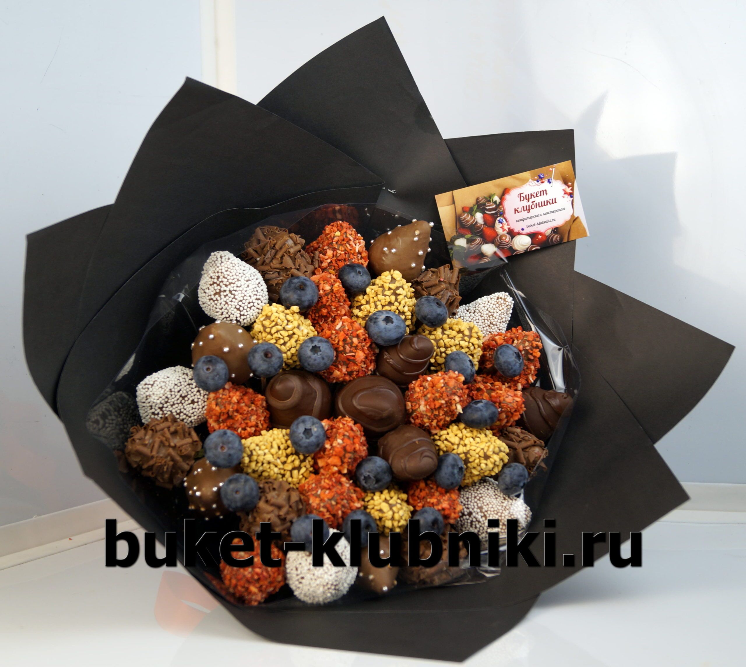 Хотите купить букет из клубники в горьком шоколаде с голубикой в Москве? В нашей компании Вы можете заказать изготовление букета из клубничек в темной глазури с ягодами голубики.