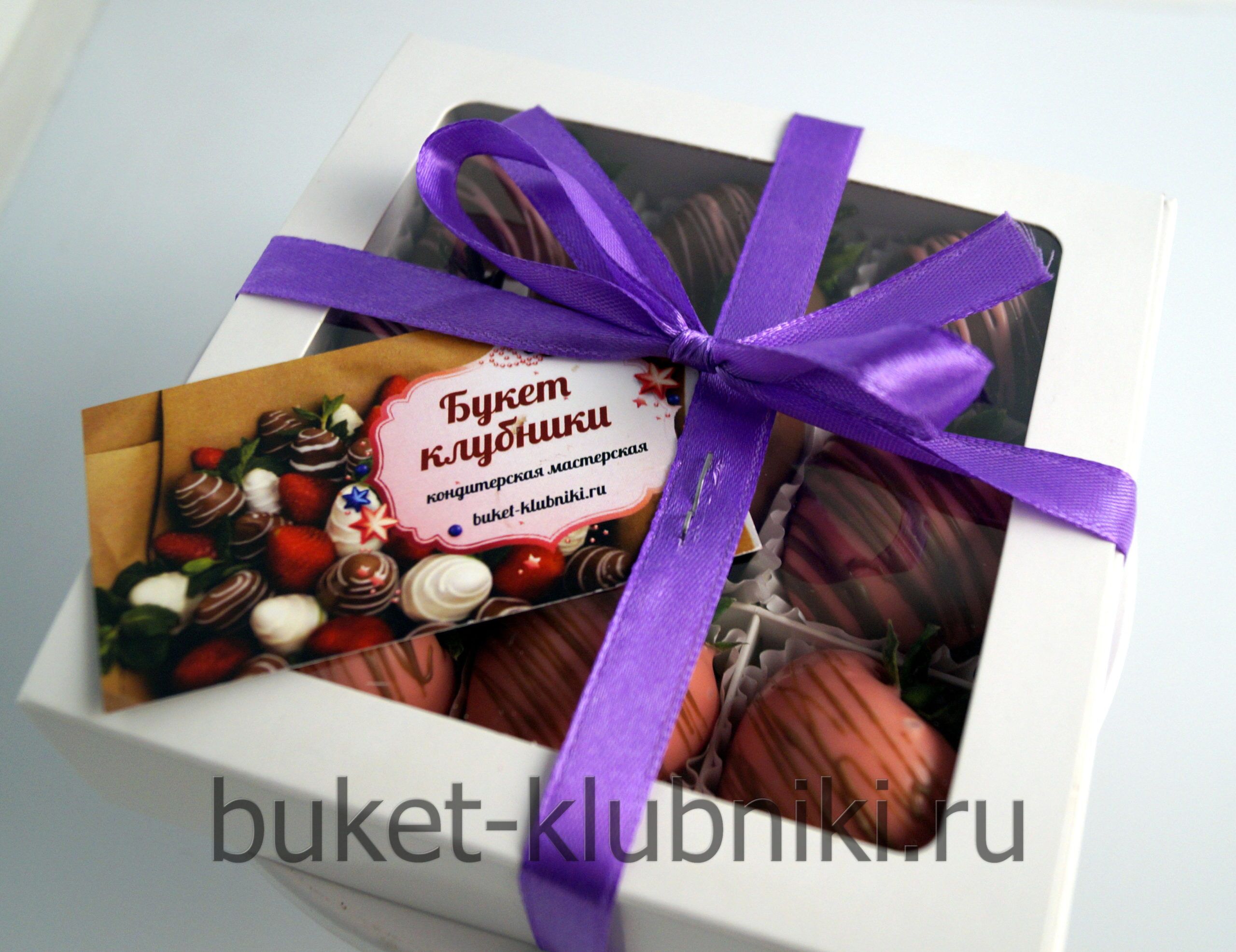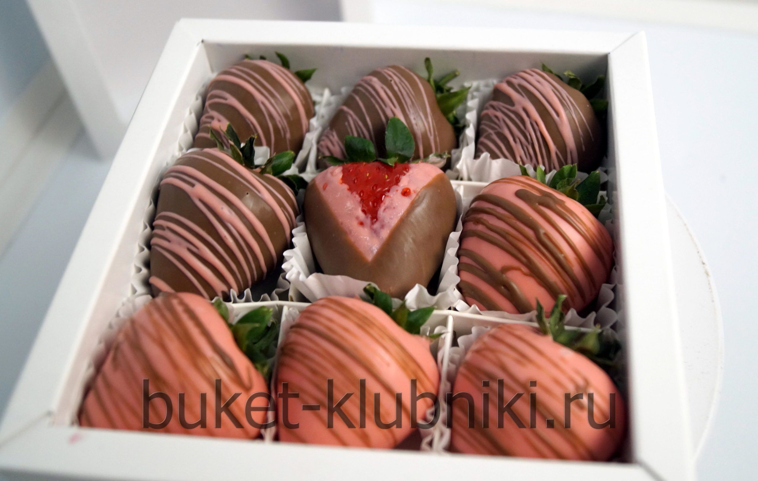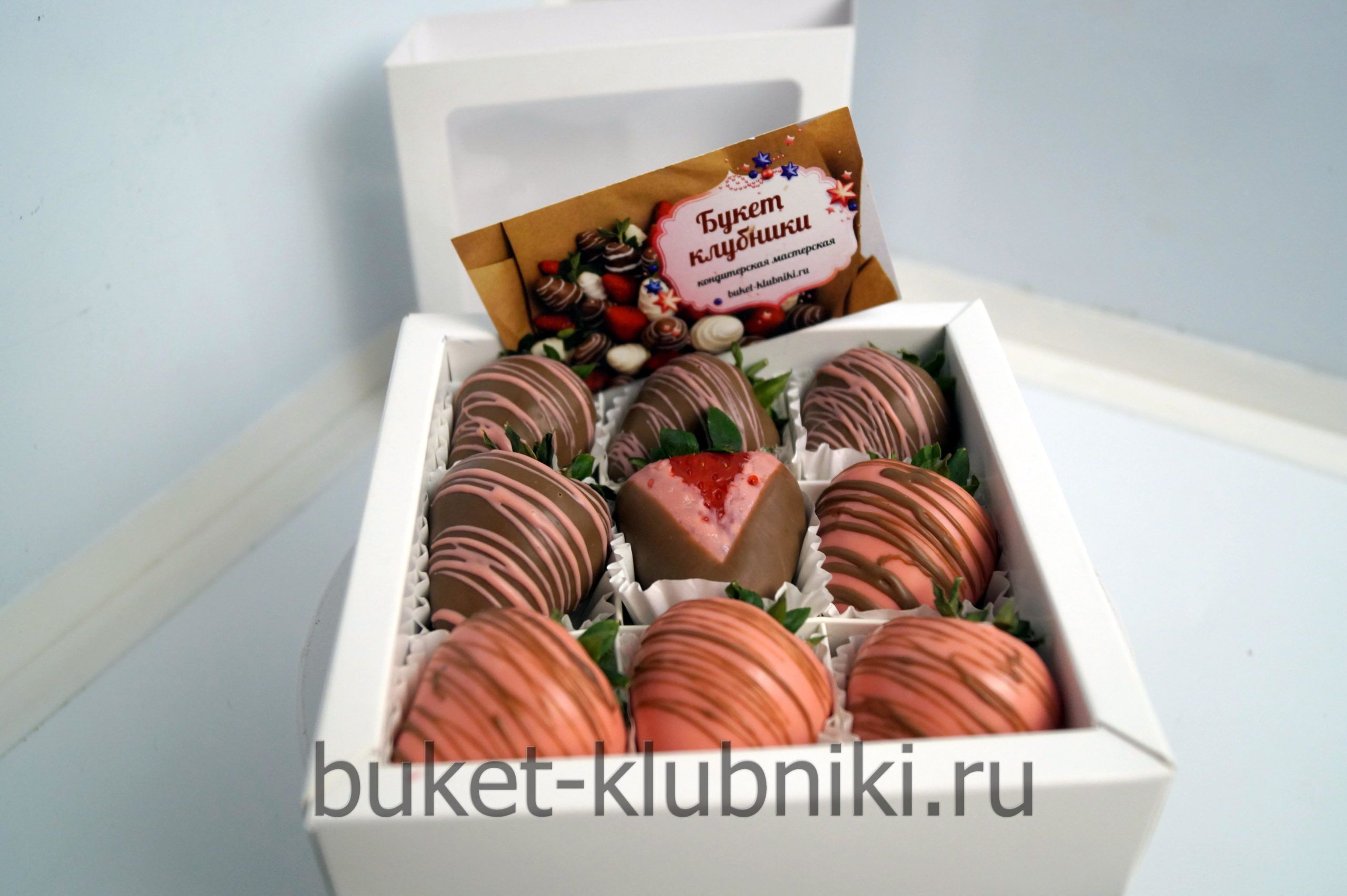 Подарочный набор на 9 ягод в молочном и розовом шоколаде. Набор упакован в белую коробку с крышкой имеющим прозрачное окошко сверху. Изделие фиксируется ленточкой с бантом.