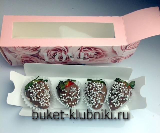 “Жемчуга” мини подарочный набор (4 шт.) вкусные клубники в молочном темном шоколаде с кондитерской съедобной посыпкой зеркальные шарики. Набор упакованный в подарочную коробку с прозрачным окошком через которое видно клубнички. Упаковка открывается с левой или правой стороны, после чего выдвигается картонный поддон с “вкусняшками”.